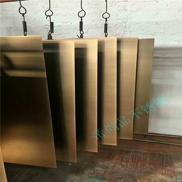 不銹鋼鍍銅板采用德國先進水鍍技術(shù),使不銹鋼表面鍍上一定厚度的真紫銅,黃銅。達到能做舊拉絲仿古高端裝飾,解決了以往銅鋼復(fù)合板材料由高分子膜復(fù)合易分離、起泡的缺點。    (2)不銹鋼鍍銅板材具有可以點焊、滿焊的特性,剪折無脫離。適應(yīng)性更強,適用范圍更廣,解決了以往復(fù)合板材焊接時容易出現(xiàn)的起泡剝離等問題。    (3)不銹鋼鍍銅板可以滿足異型加工需求,可以應(yīng)用于銅工藝產(chǎn)品加工及特殊環(huán)境使用。